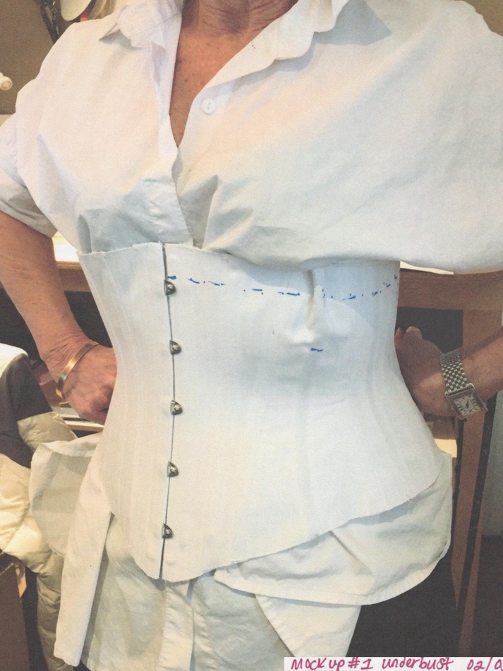 I sketch my ideas and begin draping material on my mannequin. It is important to use material similar to what will be used for the final piece. What I envisioned in my initial sketch may end up changing because some fabrics drape better than others and some shapes work well with particular fabrics. From there, a pattern is drafted and a sample (or mockup) is created. I fit countless samples on the wearer to decide the final measurements. It can take anywhere from 2-5 fittings per corset to finalize the perfect fit. The final trims and fabrics are meticulously sourced from around the world and every sample and corset is carefully and thoughtfully handcrafted in my design studio in Connecticut.
